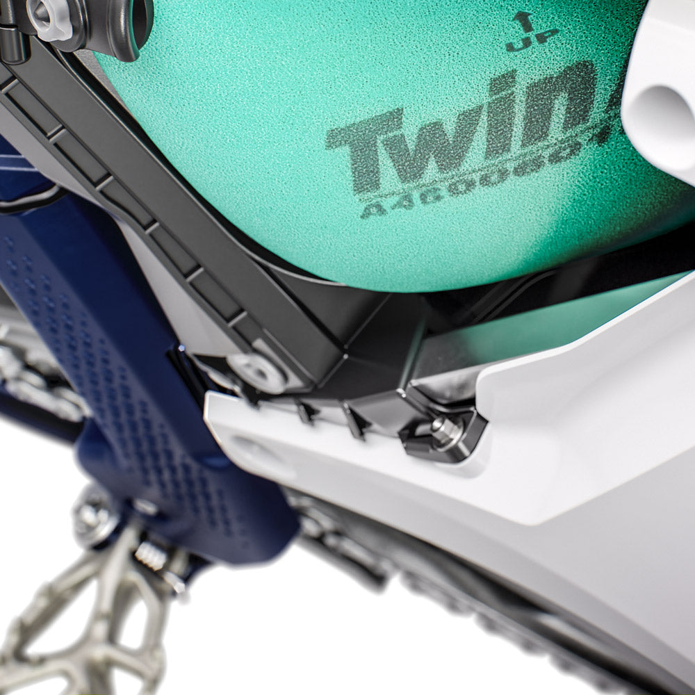 A strong, one-piece airbox design with an optimised air intake reduces air deformation, ensuring an unrestricted flow of air and maximum filter protection. The Twin Air filter is easily accessed without tools, by simply removing the left side panel for easy maintenance.