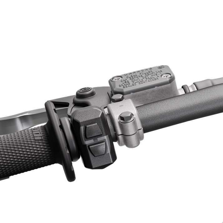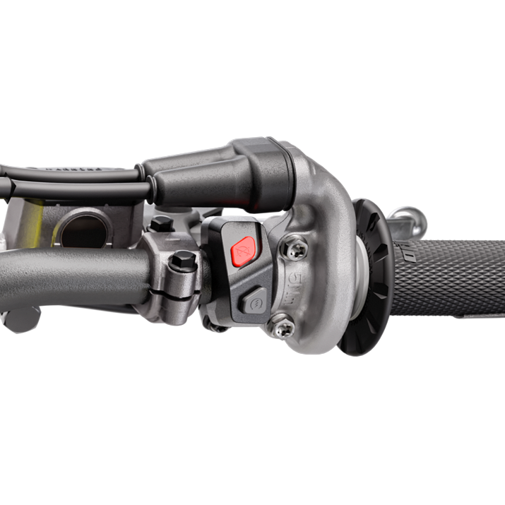 The combined engine start/stop switch is located on the right side of the handlebar for easy, thumb-operated use. Not only simplifying the starting and stopping of the engine, but the removal of an additional stop only button from the handlebar reduces the risk of potential damage or activation in the event of a fall.